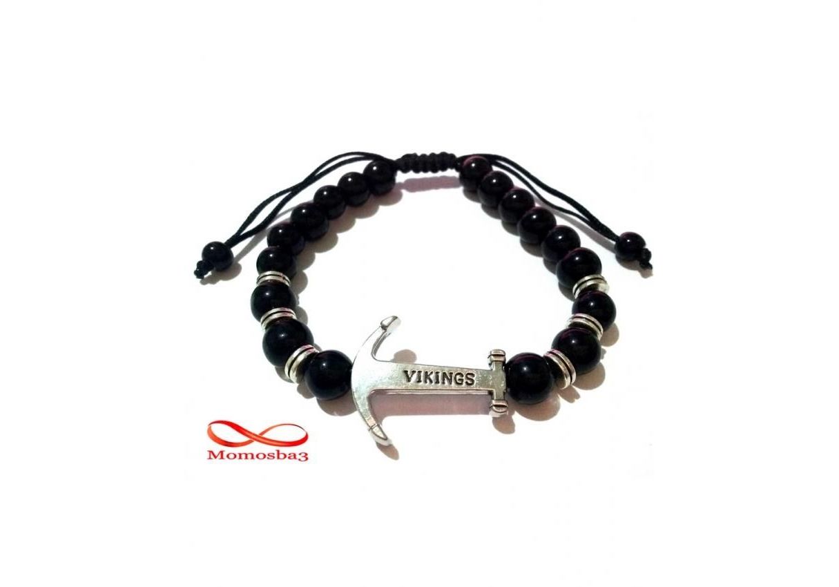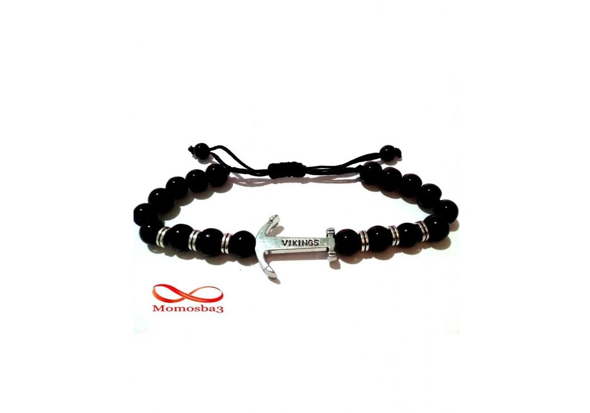 Agate Perles Noir Avec Pendenti Ancre Vikings Argent Réglable