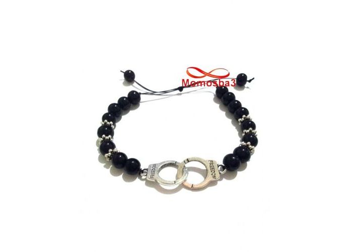 Agate Verre Noir 8mm Avec Pendentif Menotte Argent Charm - Réglable