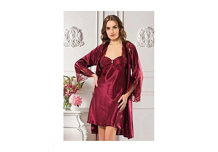 Caractéristiques de Chemise De Nuit 2 pièce satin dentelle détaillée courte nuit matin ensemble - Rouge Foncé