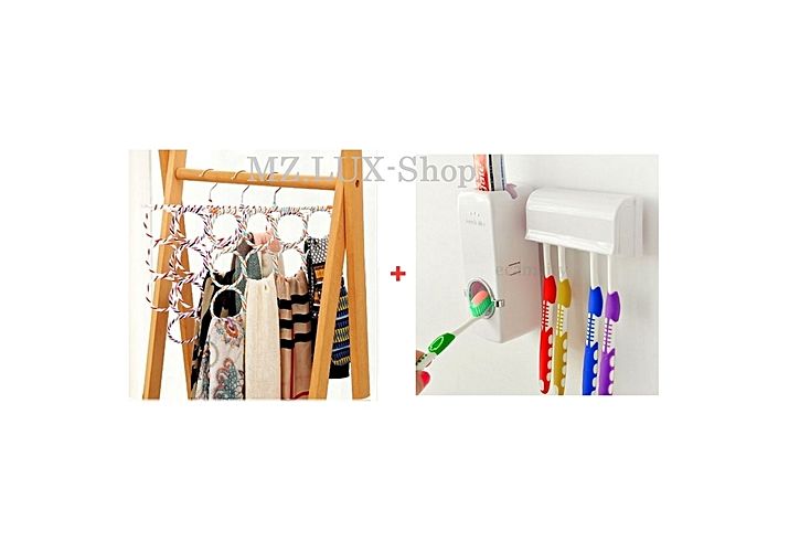 Pack Porte foulards et chAles Multifonctionnel et Distributeur automatique dentifrice avec porte brosse a dent colle au mur.