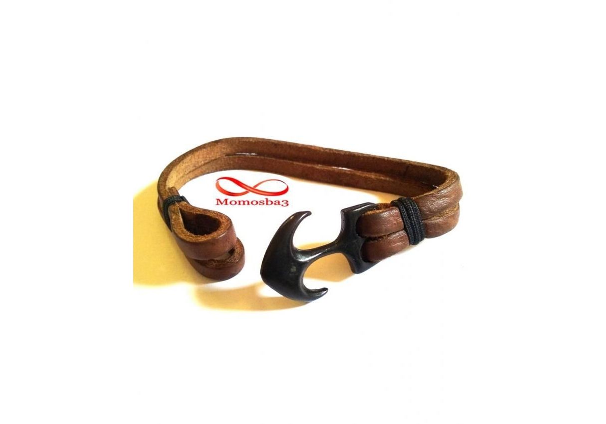 Bracelet Ancre Marine Noir Sur Cuir MARRON (Réglable)