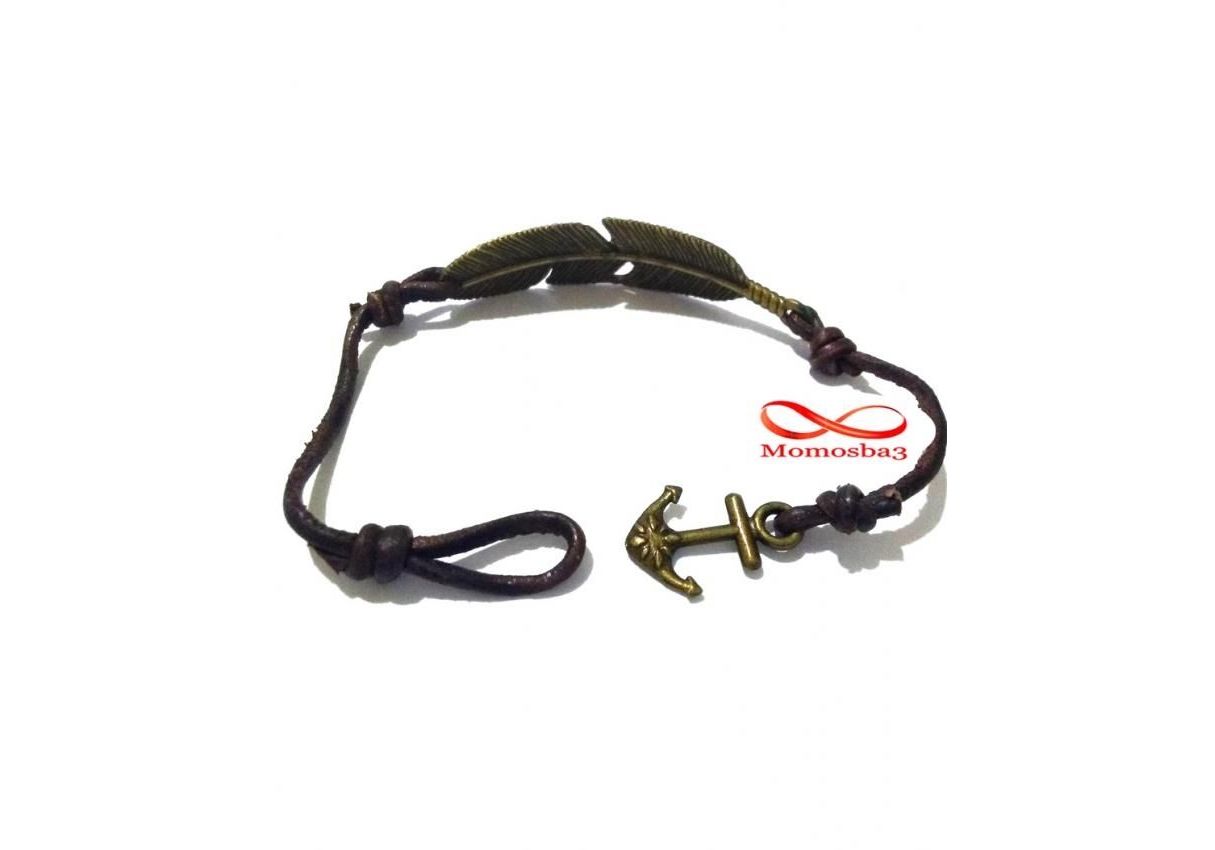 Bracelet Cuir MARRON Pendentif Plume Fermoir Ancre Marine BRONZE Réglable