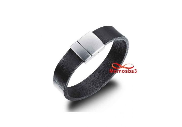 Bracelet Cuir Noir Avec Fermoir En Acier Inoxydable Magnetique Argenté + Sachet de Bijoux