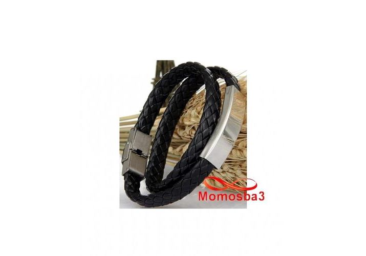 Bracelet Deux Tour Cuir Noir Plaque Et Fermoir En Acier Inoxydable Unisex - Réglable