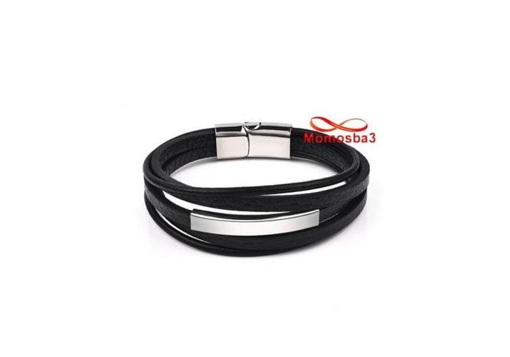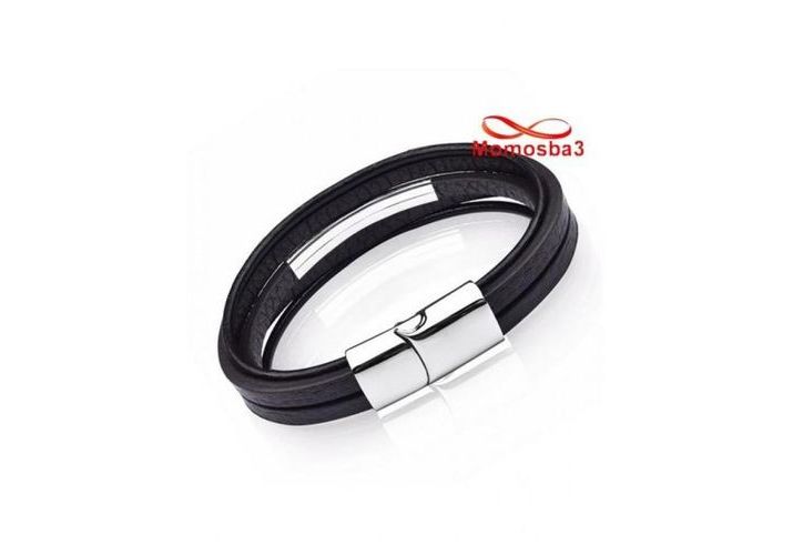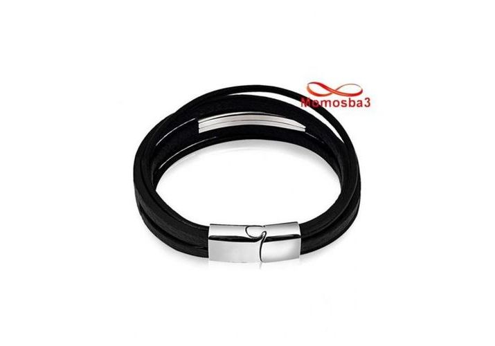 Bracelet En Cuir Noir Et Acier Inoxydable + Sachet De Bijoux