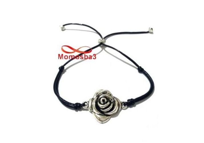 Bracelet Fil Noir Avec Pendentif Fleur Argenté Charm - Réglable