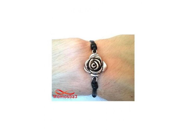 Bracelet Fil Noir Avec Pendentif Fleur Charm Argenté Réglable