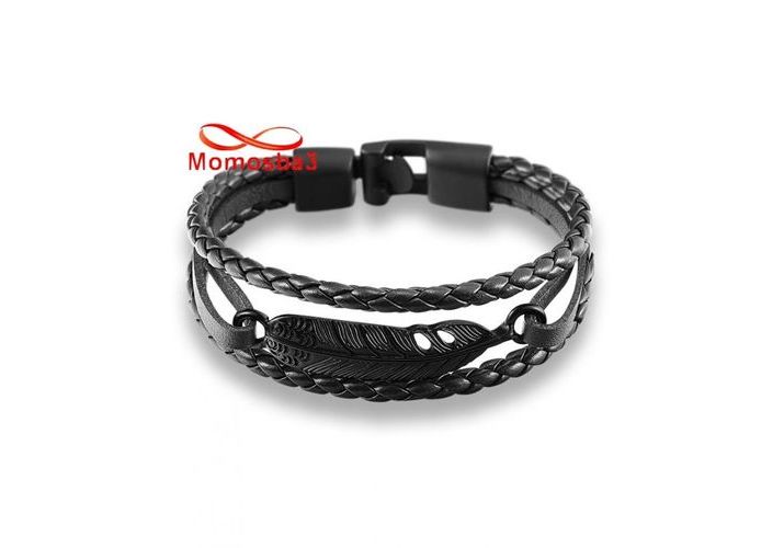 Bracelet Plume En Cuir Noir Véritable Symbole Et Fermoir Noir