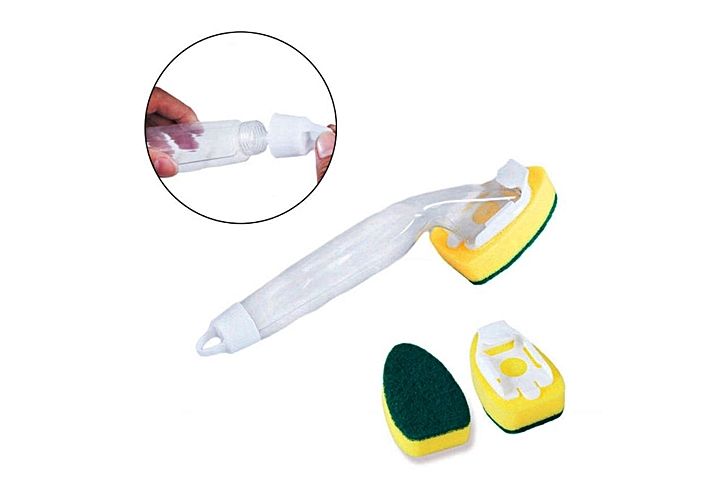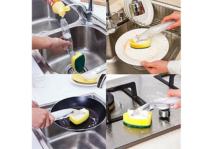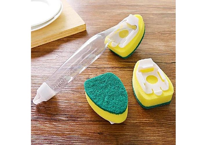 Brosse de Cuisine avec eponge avec poignee de distributeur de savon liquide avec 3 brosse rechargeable