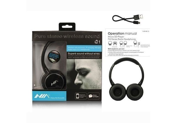 Modèle: Casque Bluetooth NIA Q1 Over-ear avec Micro Support Micro SD SD / Radio FM / Entrée Aux Couleur: noir Utilisation générale: Pour le téléphone portable, pour l'ordinateur, pour le joueur de médias Réponse en fréquence: 20Hz-20KHz Fonctions 4-en-1: casque Bluetooth + lecteur Micro SD / TF + radio FM + connexion par câble de 3,5 mm Profils Bluetooth compatibles: A2DP, AVRCP, HSP, HFP Version Bluetooth: V4.2 Plage de fréquences FM: 87 MHz - 108 MHz Diamètre du haut-parleur: 40mm Radio FM intégrée Lecteur MP3 intégré Carte TF prise en charge.