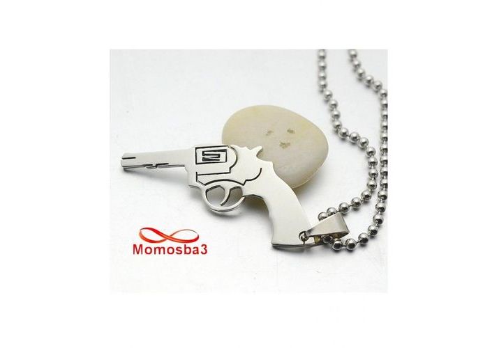 Chaine En Acier Inoxydable Avec Pendentif Pestol Revolver Taille Moyenne Argenté