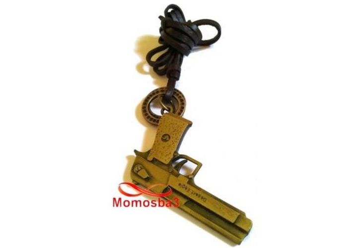 Collier Cuir MARRON Réglable Avec Pendentif Pistolet Bonze - Unisex