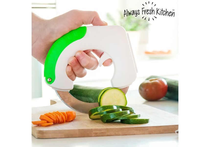 Coupez vos aliments plus facilement et rapidement grâce au couteau circulaire Chop & Roll ! Son design innovant et pratique permet de couper rapidement et en toute sécurité. La lame peut tourner ou rester fixe selon les aliments et les besoins (un levier permet de la fixer). Idéal pour les légumes, les tartares, les steaks fins, etc.