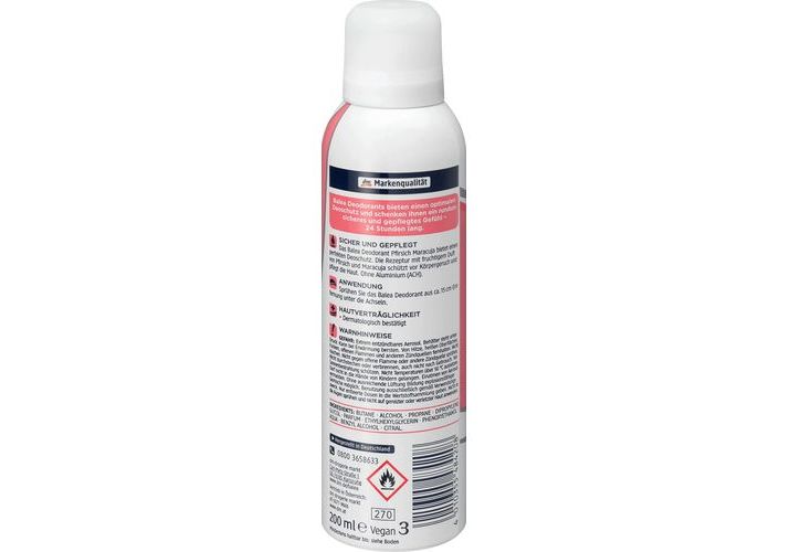 Pour une sensation de sécurité et de propreté totale - 24 heures: Le Balea Deodorant Peach Maracuja offre une protection parfaite contre la désodorisation. La recette au doux parfum de pêche et de fruit de la passion protège contre les odeurs corporelles et nourrit la peau.