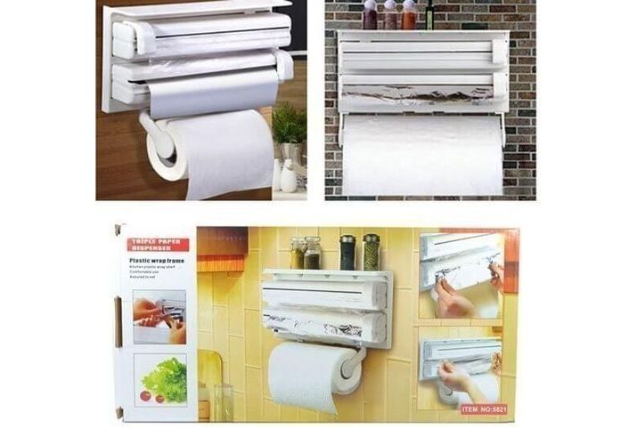 Le distributeur de rouleau de cuisine 3 en 1 est utile d'avoir dans votre cuisine. Il contient des films en plastique, des rouleaux de papier et des feuilles d'aluminium et les met à disposition instantanément sans avoir à le retrouver dans la maison. Il a un corps en plastique ABS compact et peut être monté sur le mur avec des vis. Les coupeurs avec roues à roulettes à roulement doux dans chaque compartiment recèlent des feuilles d'aluminium et des films plastiques sans problème. Plus besoin d'utiliser des couteaux et des ciseaux à des fins d'emballage !! La partie supérieure peut être utilisée comme étagère pour conserver les petits récipients pour aliments. Ce distributeur et porte-charge du Triple rouleau de cuisine est simple à monter, avec mécanisme de chargement avant et support en papier, ce qui facilite l'utilisation.