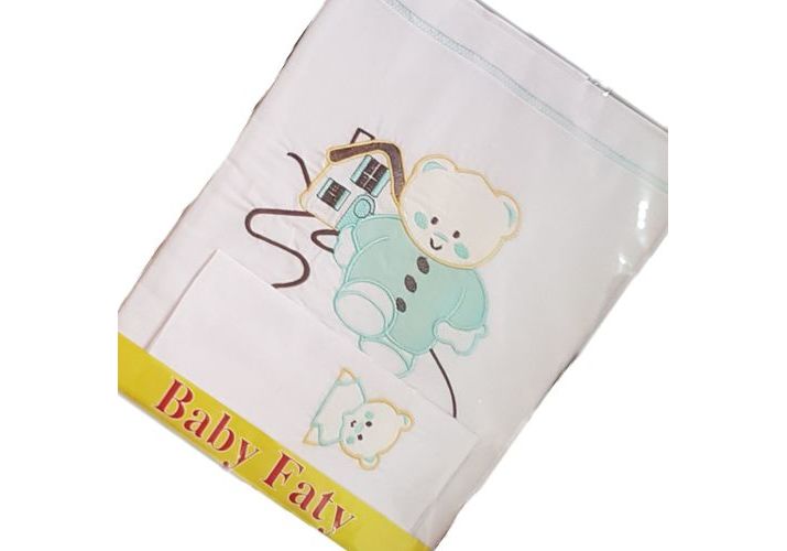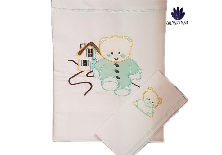 tout en tendresse pour ce drap-housse plein de poésie au motif brodé d'un ourssan souriant et coloris frais.