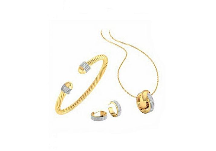 Worldtime vous propose cette parure de 3 pièces signée Fierro "Elements Of Style"Cette parure est composée d'un bracelet torsadé type bangle, d'une paire de boucles d'oreilles et d'un collier et son pendentif, le tout incrusté de Zirconium pour vous apporter cette touche de brillance et d'éclat. Vous brillerez de mille feux avec ces accessoires.