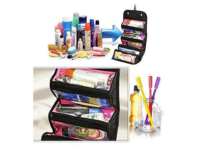 Il va tenir vos cosmetiques, articles de toilette, bijoux, et plus encore dans quatre compartiments a fermeture a glissiere separes enroule dans un sac compact pour un transport facile.