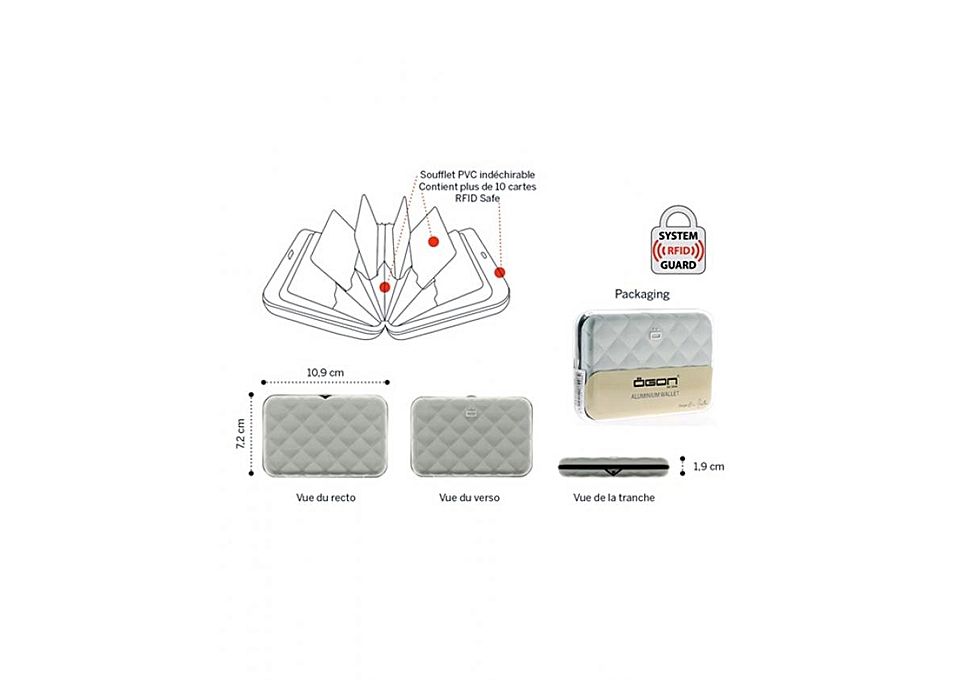 Le portefeuille Ögon peut contenir jusqu'à 10 cartes ou cartes de crédit, en fonction de la quantité de billets que vous avez. Le design Ögon vous protège également contre la lecture des puces de données de vos cartes (RFID Safe). La coque en aluminium anodisé et polycarbonate protège vraiment vos données.