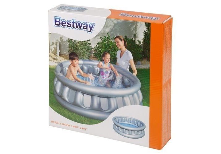 La piscine a une capacité de 512L d’eau et gonfle à 1,57 m (diamètre) x 41 cm (hauteur).