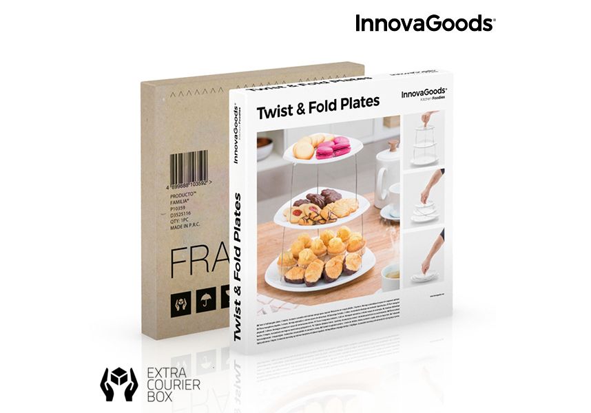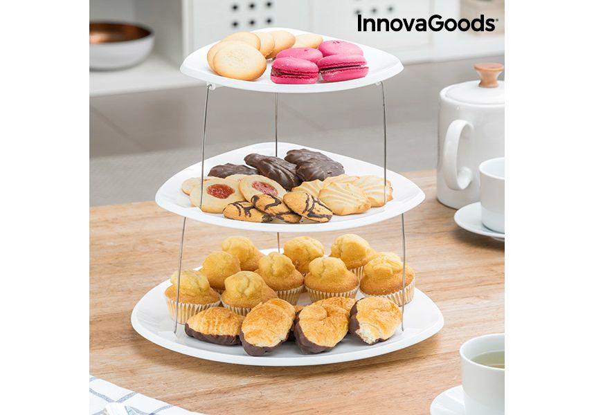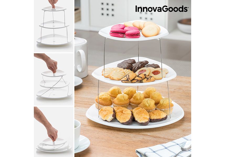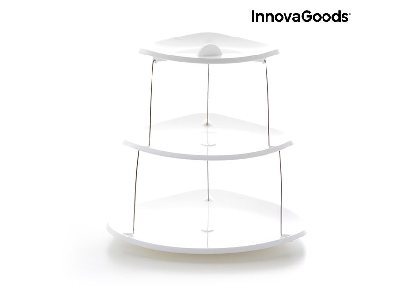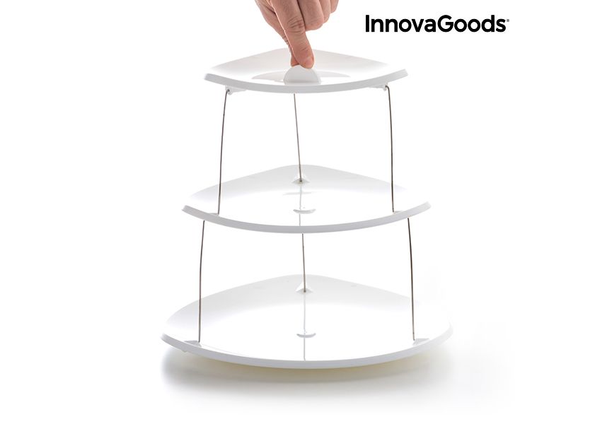 Les cuisines les plus modernes et originales pruvent désormais profiter des avantages des nouveaux et pratiques plats pliants rotatifs InnovaGoods Kitchen Foodies ! Déplié, il a une forme de tour avec 3 plats reliés entre eux par une structure métallique. Il se déplie facilement en tournant et en tirant vers le haut. Il se plie également en toute facilité en tournant et en appuyant vers le bas. Cette invention innovante prend un minimum d'espace.