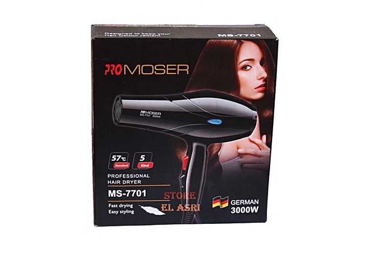 - Il sagit dun sèche-cheveux Pro Moser de 3 000 W avec 2 vitesses.