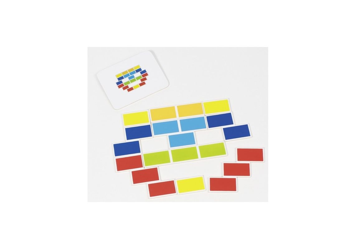 Les pièces de ce puzzle segmenté doivent être assemblées de façon à correspondre au modèle donné. On pose pour cela le modèle sur la face bleu