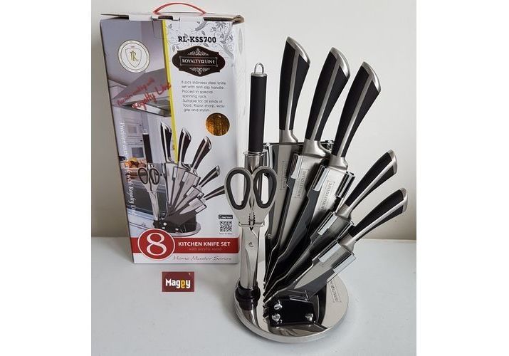 Magnifique ensemble de couteaux tout-en-un de cuisine pratique pour avoir tout à porté de mains sur votre plan de travail.Support pliant et pivotant à 360°, avec hachoir, couteau du chef, couteau à pain, couteau universel, couteau d'office, ciseau, fusil, tranchant exceptionnel.