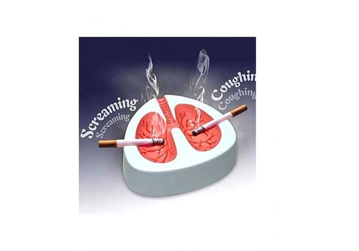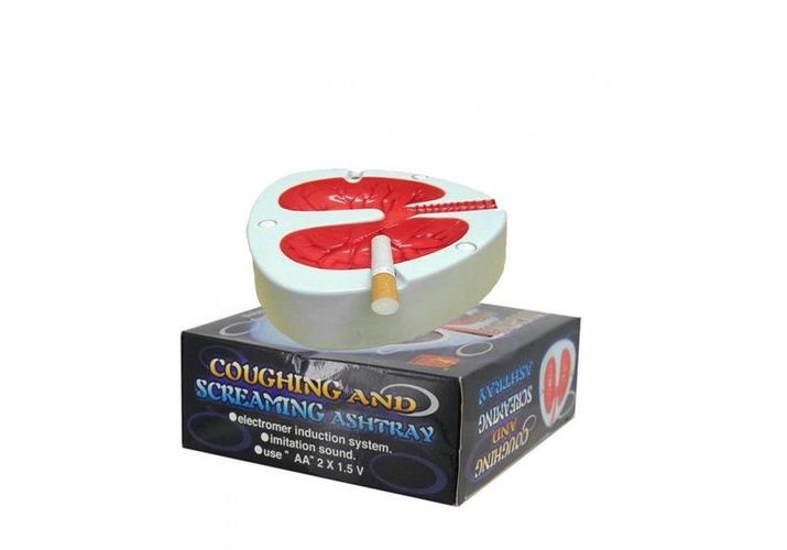 Voici le cendrier tousseur : pourquoi tousseur ? Parce que lorsque vous posez une cigarette sur l'un des deux emplacements prévus, le cendrier tousse et sur l'autre emplacement il crie de douleur pour vous signifier qu'il est fort désagréable de se faire "en goudronner les voies respiratoires" ! De part son design en forme de jolis poumons écarlates, ce cendrier a bien entendu pour but de sensibiliser au maximum des dangers de la cigarette !