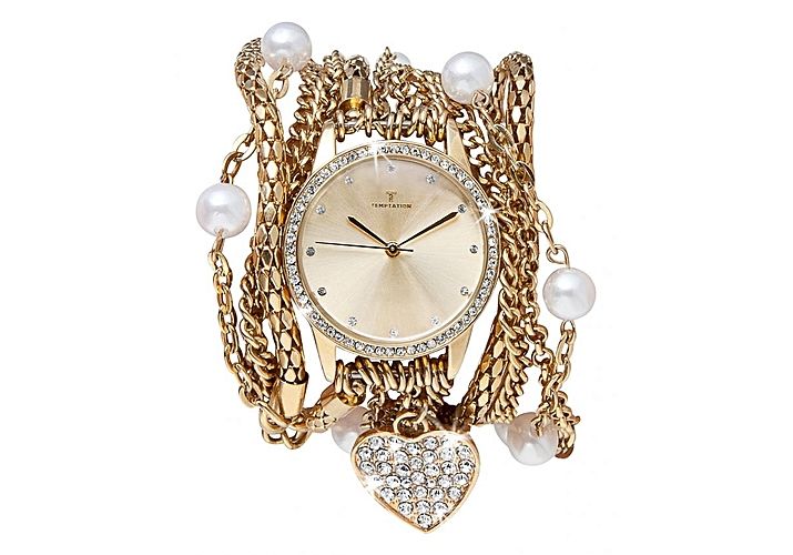 La marque allemande Temptation vous propose cette montre bracelet chic et élégante pour accessoiriser votre tenue. Perles blanches, chaines en plaqué or et Charme en forme de cœur incrusté de Zirconium font de ce bijoux un indispensable de la saison