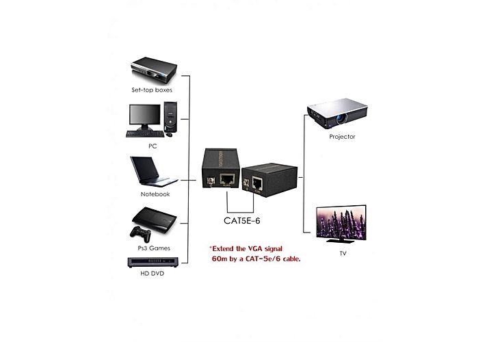 Autoriser signal entre les ports vidéo VGA de transmission pour des distances allant jusqu'à 60 mètres sur CAT5, CAT6 Ethernet (câble non inclus). ,La qualité de la distance et de l'image dépend de la longueur et efforçons de le câble Ethernet, et la résolution que vous souhaitez transmettre.