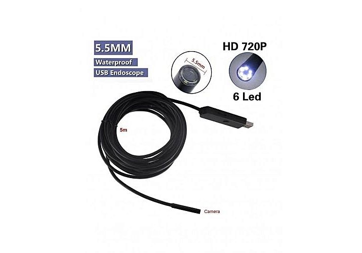 Caméra très fine de 5.5 mm montée sur câble USB (5 mètres). Munie de 6 LED, éclairez et filmez des endroits normalement inaccessibles et sombres. Qualité et netteté surprenante des images même quand vous mettez la caméra à quelques millimètres d'un objet (effet microscope).Logiciel inclus. Molette permettant d'allumer, d'éteindre ou de régler l'intensité des 6 LED. Etanche. Résolution optique 640 x 480 pixels. Interface usb 2.0.